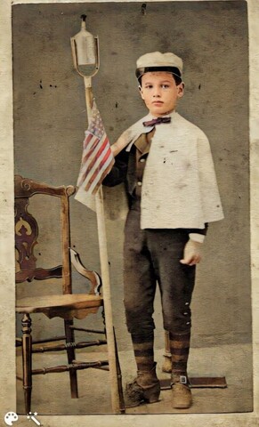 An anonymous boy is suited up for an 1890s political torchlight parade
