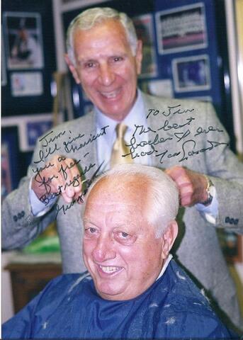 Former California Governor George Deukmejian giving a haircut to former L.A. Dodgers Manager Tommy Lasorda