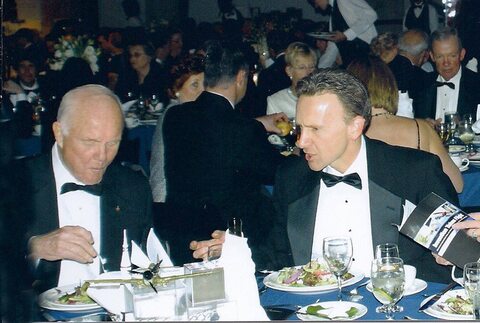 This photo of us in tuxedos and at dinner shows me beginning to tell him that President Bush wanted me to collect the control stick from John's 1962 spacecraft Friendship 7 (John told me earlier he kept as a souvenir). I told him that the attorney general wanted it back, or else they'd swear out a warrant for him removing government property! I thought he was going to choke on his rubber chicken dinner before he realized I was just kidding him...